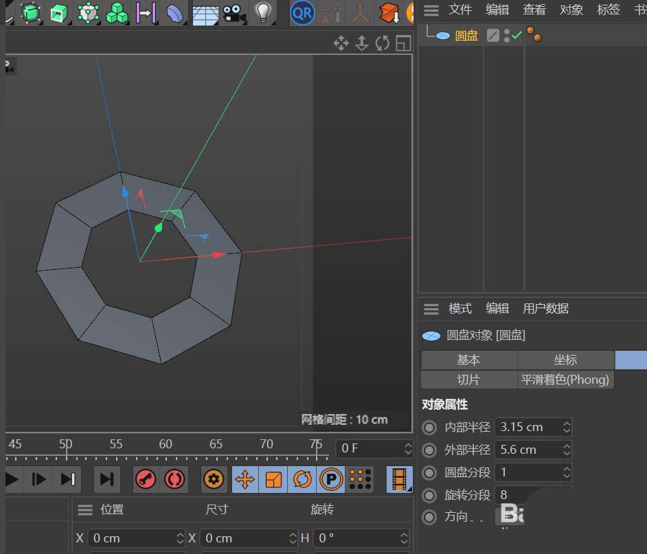 創(chuàng)建一個圓盤:內部半徑為3.15,外部半徑為5.6,圓盤分段為1,旋轉分段為8.