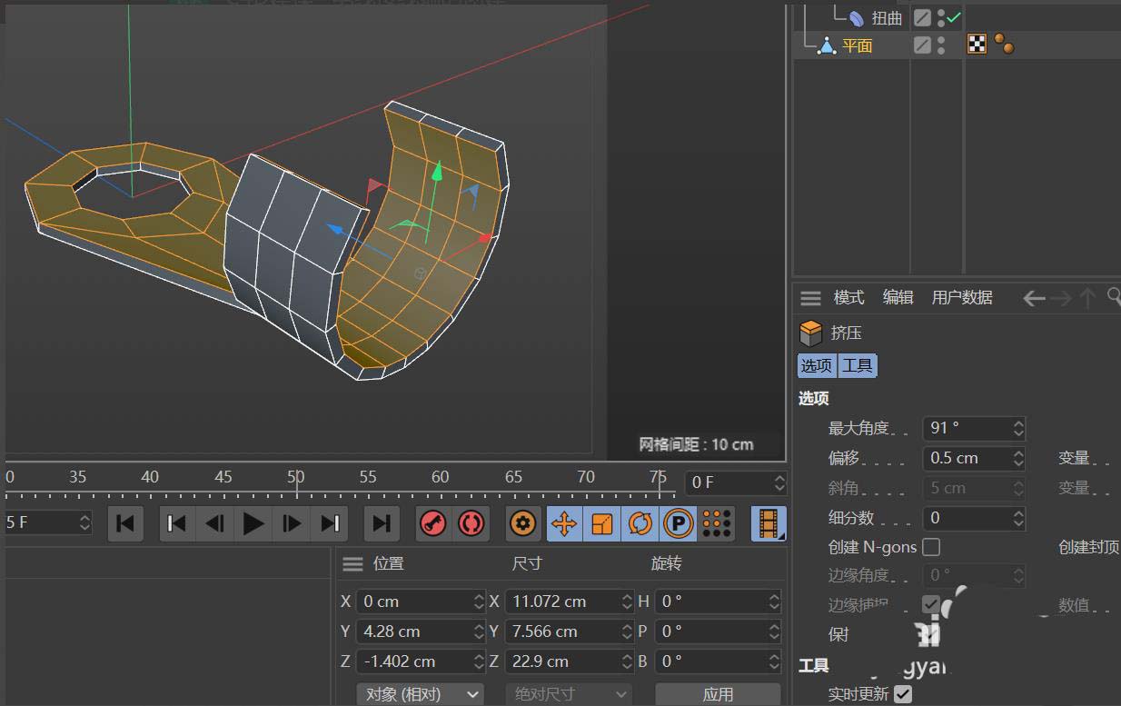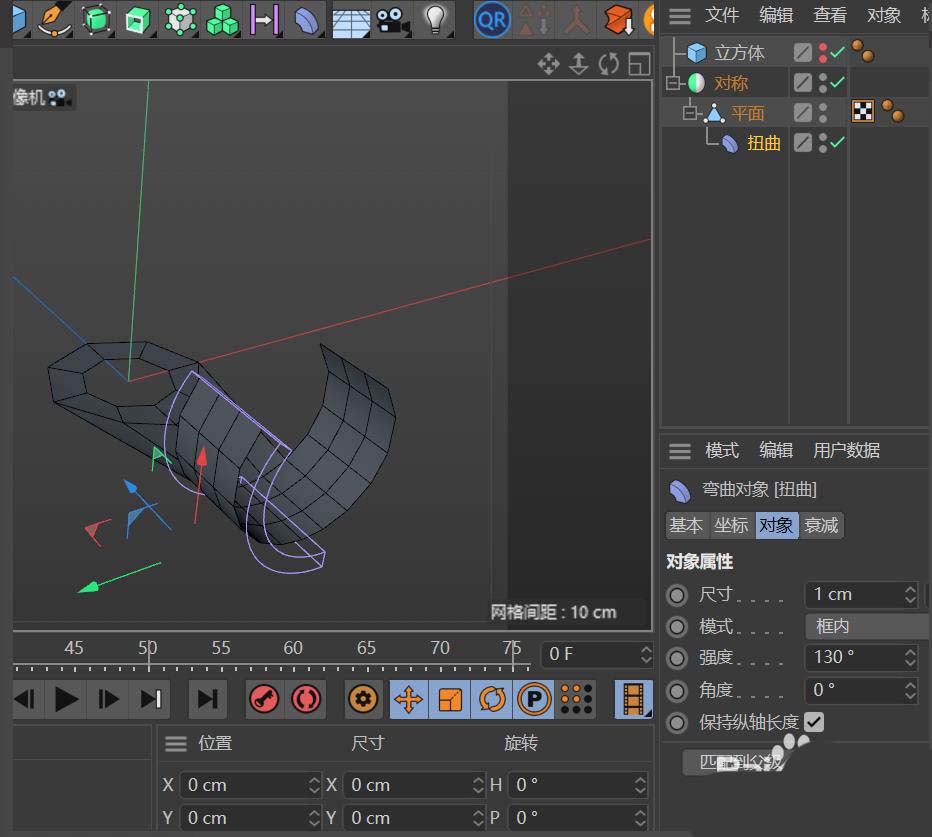給對象添加一個扭曲變形器,將變形器調整匹配到平面的區(qū)域,選擇為框內模式,強度調整為130度;將當前狀態(tài)轉為對象。