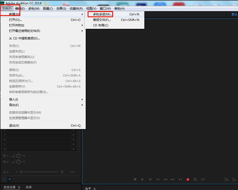 1.首先在電腦中打開AU軟件,點擊頂部工具欄中的“文件”——“新建”——“多軌會話”。