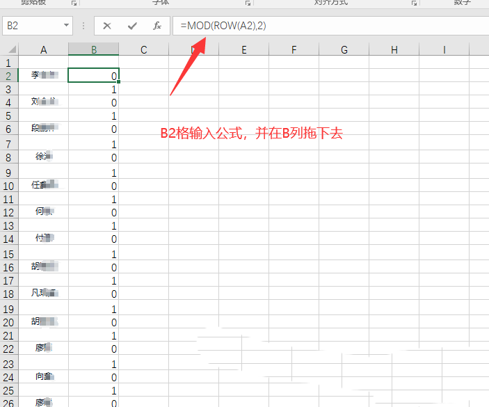 在B2格輸入公式 “=MOD(ROW(A2),2)”,并向下拖到數(shù)據(jù)最后(到了這里,對excel有點(diǎn)經(jīng)驗(yàn)的就不用看下去了,不太熟的繼續(xù)看)