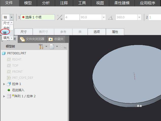 進(jìn)入陣列編輯器后,點(diǎn)擊“尺寸”下拉列表,選擇陣列類型為“軸”。