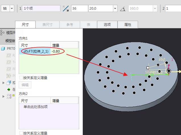 打開“尺寸”選項(xiàng)卡,添加特征與軸的間距為增量尺寸,并設(shè)定增量數(shù)值。