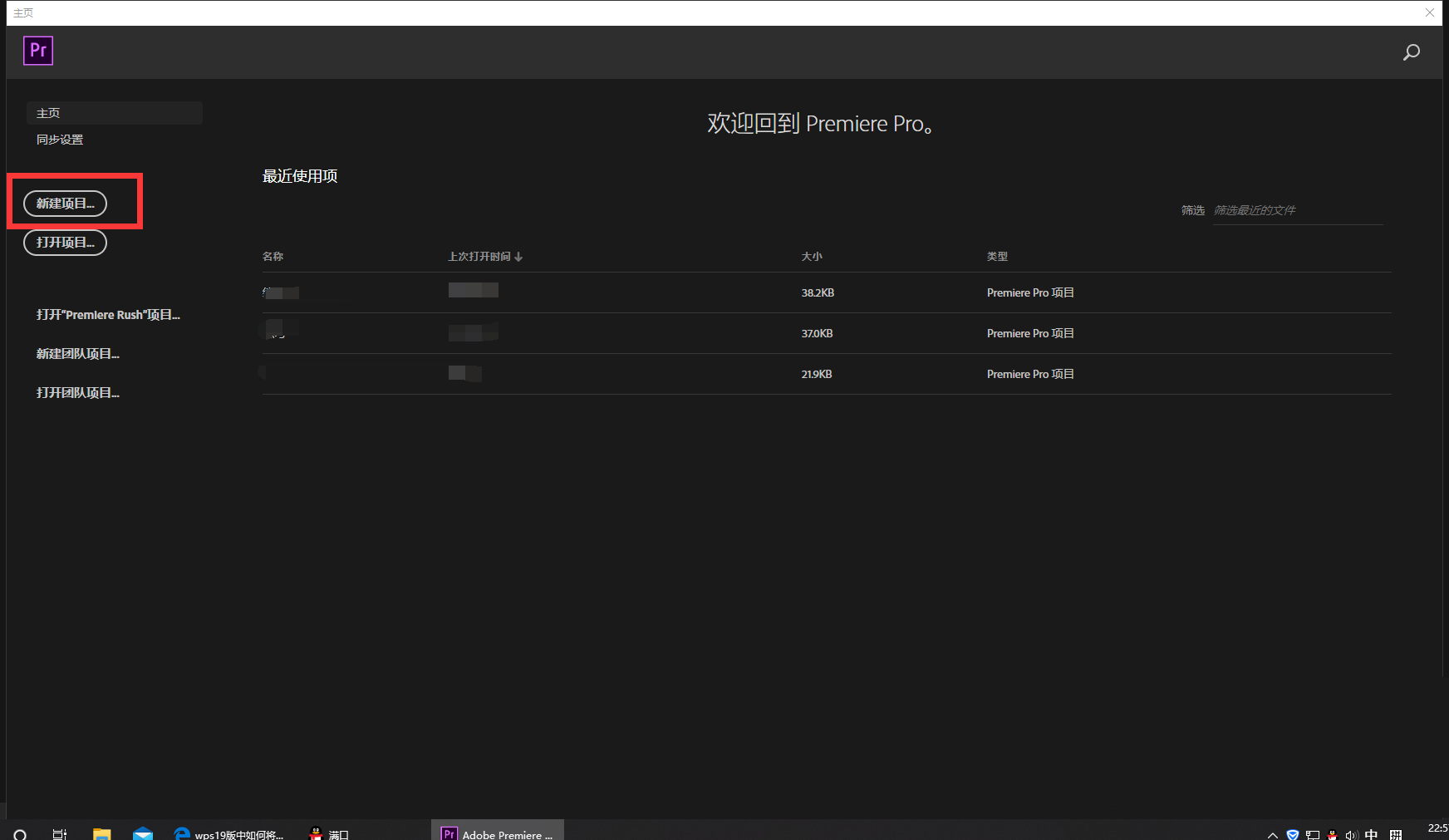 2、進(jìn)入pr2019主頁面后,我們點擊上方的”新建項目“按鈕