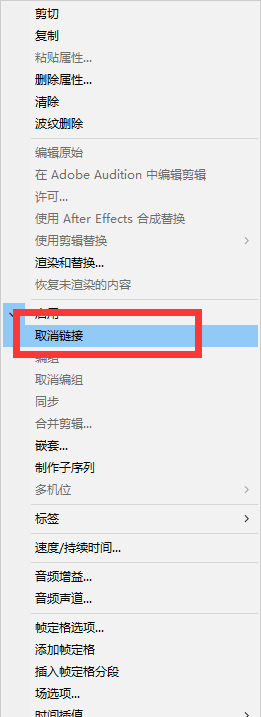 5、最后我們選中已經(jīng)連接的視頻和音頻,然后我們右鍵在彈出的菜單中選擇取消連接,就可以將視頻和音頻的連接取消了
