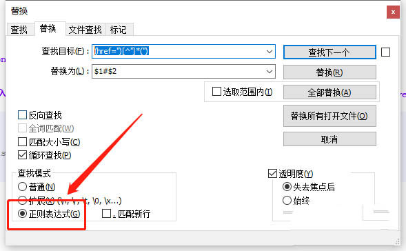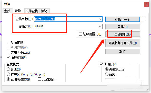5、然后在上面的【查找目標】輸入【(href=")[^"]*(")】,替換為那里填入【$1#$2】然后點全部替換