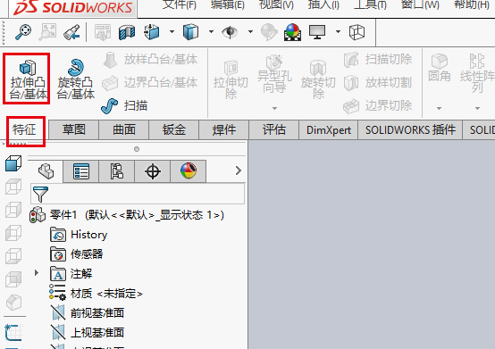 5、在菜單欄里面找到特征里面的拉伸凸臺(tái)/基體命令。