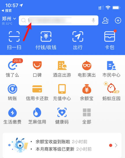 1、支付寶1號卡開通后,可以享受出行、購物等優(yōu)惠。開通后,會贈送消費券,不使用不扣費。每個月最多扣除8.8的卡費。打開支付寶后,點擊上方的搜索框。