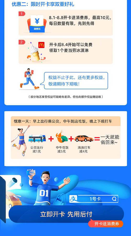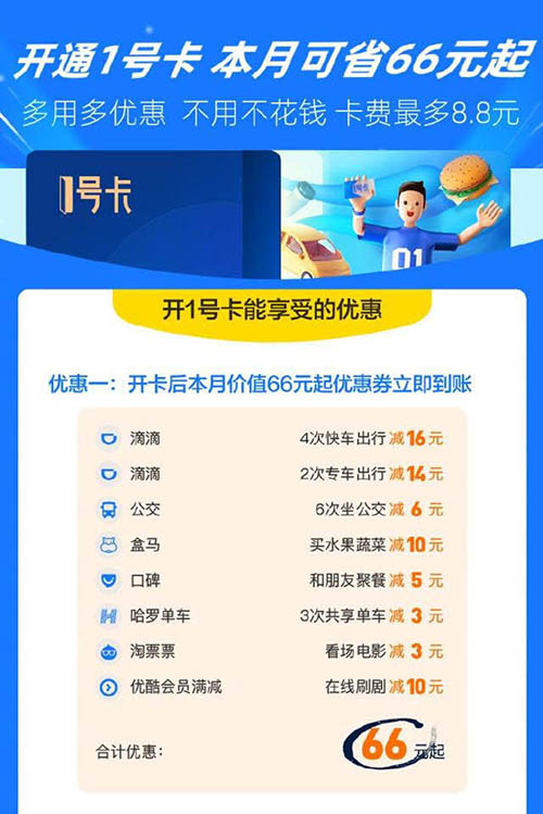 開通1號卡后30天內(nèi)可享受以下權(quán)益,滴滴出行快車4元無門檻券4張,禮橙專車7元無門檻券2張,公交車1元無門檻券6張,地鐵1元無門檻券6張(僅支持部分城市),哈羅單車1元無門檻券3張,盒馬10元滿減券1張,口碑5元滿減券1張,淘鮮達(dá)5元滿減券1張,大麥5元無]檻券1張(適用于支付寶-電影演出-演出門票所有在售商品,不含券類商品),優(yōu)酷會員10元滿減券1張,淘票票3元購票券1張。部分權(quán)益僅支持部分城市核銷,實際獲取權(quán)益以開卡詳情頁說明。權(quán)益原則上僅限支付寶客戶端內(nèi)支付核銷,如部分特殊權(quán)益可在第三方服務(wù)平臺進(jìn)行核銷,則用戶可使用與已購買1號卡的支付寶賬戶存在綁定關(guān)系的第三方服務(wù)平臺賬號查看相關(guān)權(quán)益并進(jìn)行核銷。根據(jù)海報介紹,現(xiàn)在開通支付寶1號卡,本月可省66元起,多用多優(yōu)惠,不用不花錢,卡費最多8.8元。支付寶1號卡現(xiàn)在面向全國87個城市開放,隨機(jī)邀請部分用戶購買使用,后續(xù)會逐步開放。