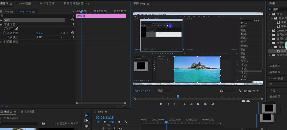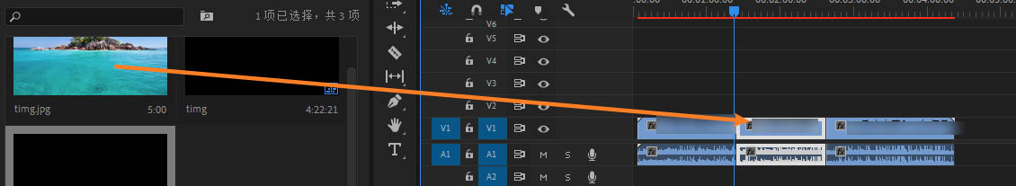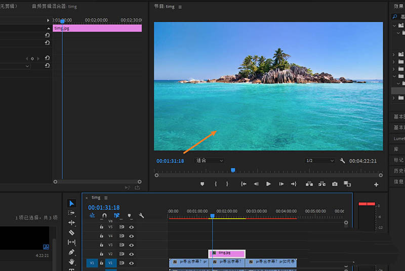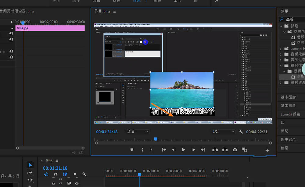 5、讓大圖變?yōu)樾D,并把圖片拉到視頻需要局部遮罩的地方,那么就在pr使用小圖遮罩住了視頻局部區(qū)域,如下。