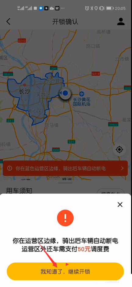 5、接下來,會彈出騎電車的注意事項,我們點(diǎn)擊“我知道了,繼續(xù)開鎖”按鈕。