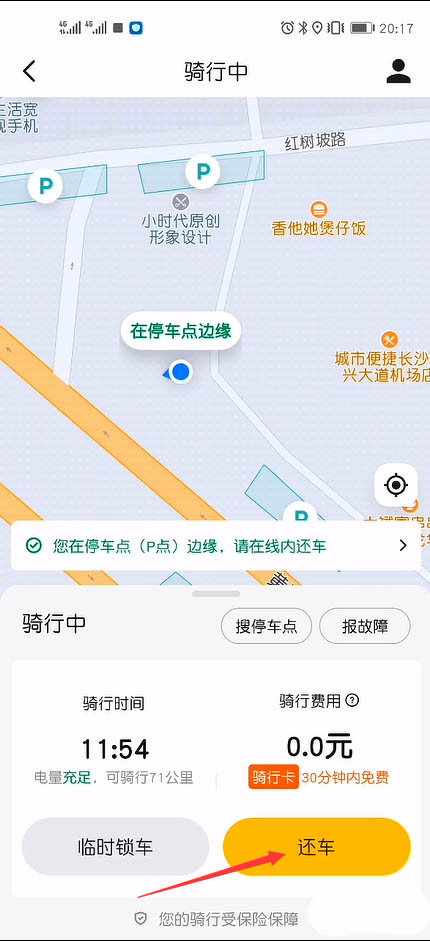 8、彈出已到停車點(diǎn),詢問你是否現(xiàn)在還車的提示頁面,點(diǎn)擊“確認(rèn)還車”按鈕。
