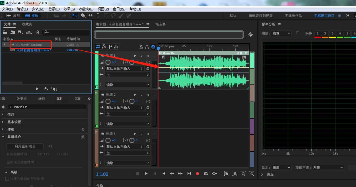 4、將左側(cè)導(dǎo)入的音頻文件,拖動至右側(cè)的多軌會話當(dāng)中。