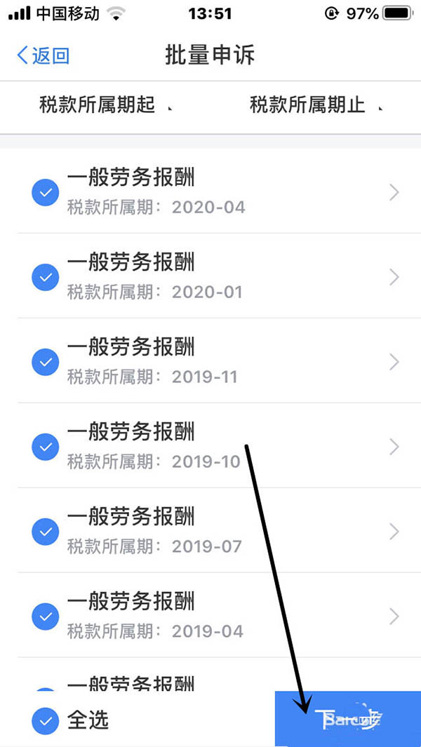 6、在批量申訴的頁(yè)面選擇要申訴后點(diǎn)擊“一步”按鈕