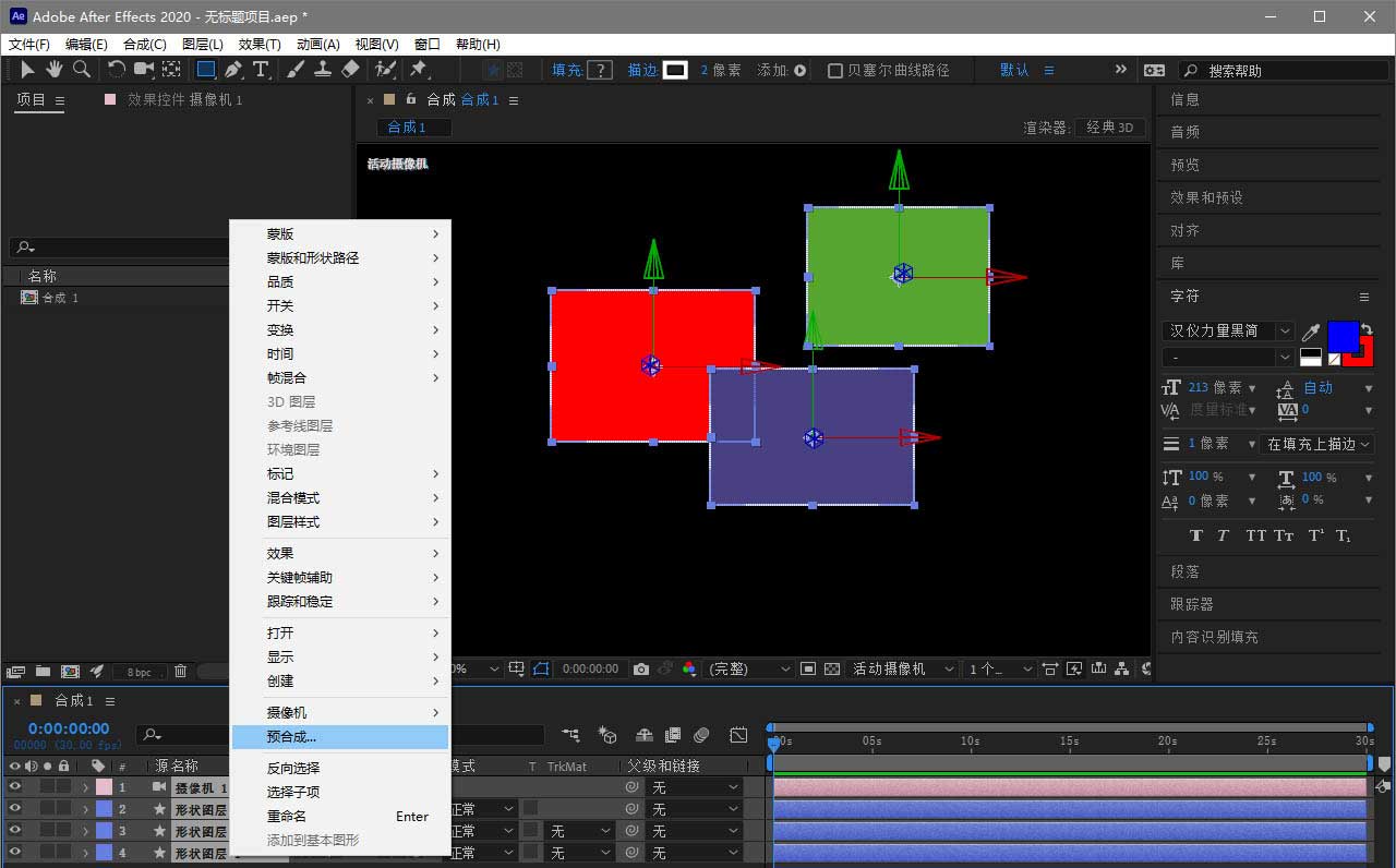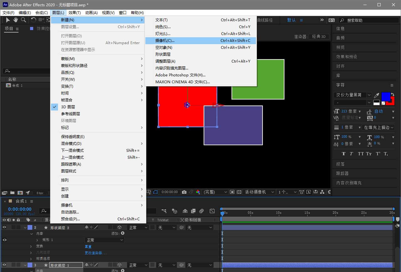 4、新建一個攝像機圖層控制形狀的三維屬性。