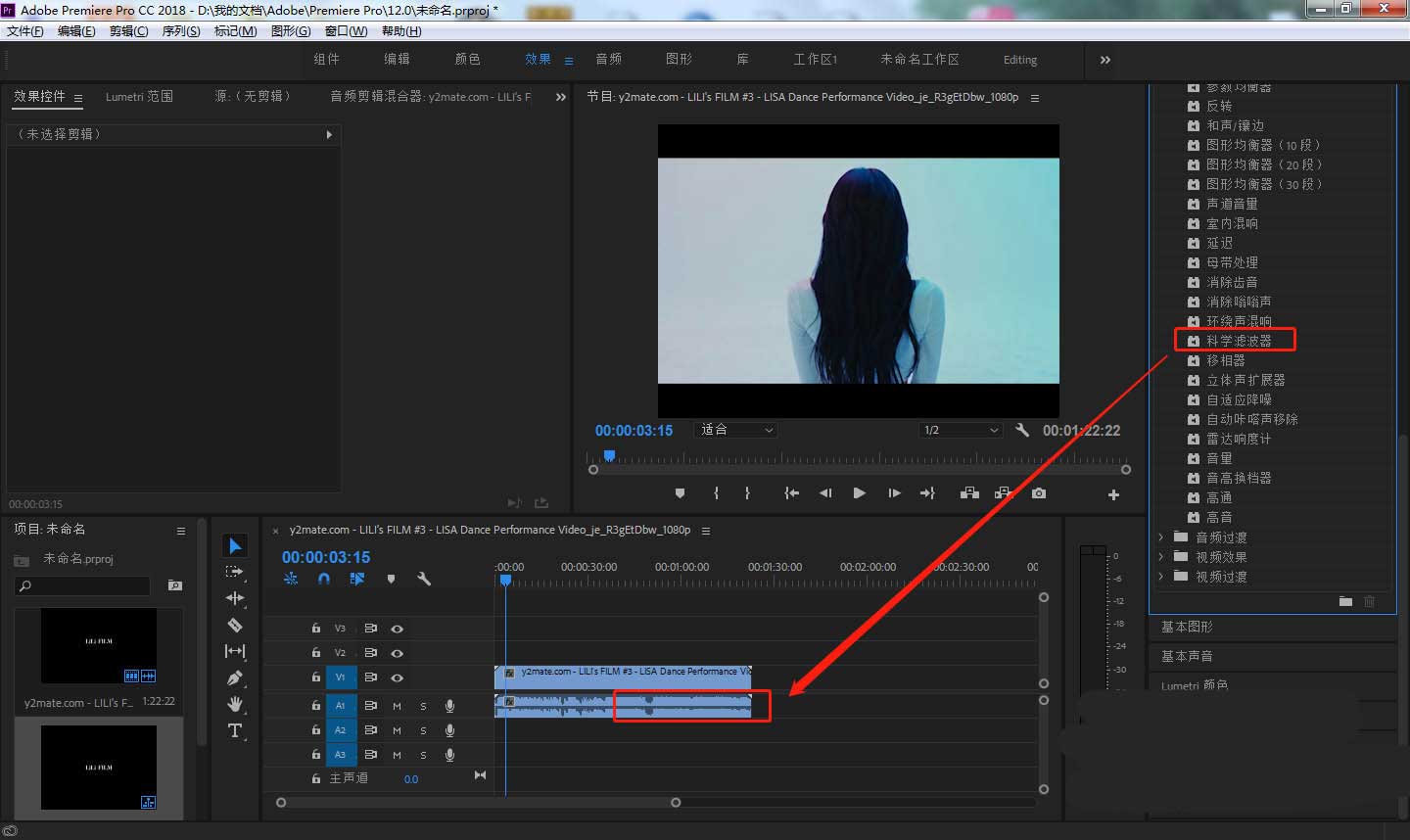 4、點(diǎn)擊右側(cè)效果窗口中的“音頻效果”——“科學(xué)濾波器”,將該效果拖動(dòng)到時(shí)間軸音頻軌道上。