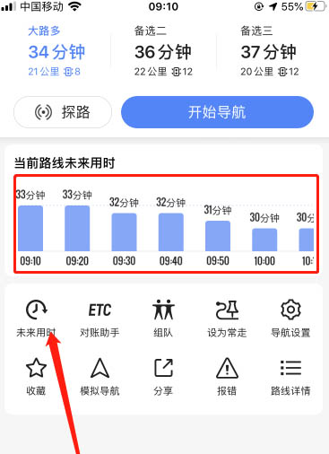 4、看到當(dāng)先路線只有之后幾個小時花費(fèi)的時間,我們點(diǎn)擊【未來用時】