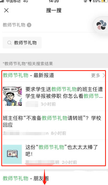 5、可以搜到相關(guān)內(nèi)容,可以看到關(guān)于此關(guān)鍵詞最近的報道,往下拉會有跟多的信息,比如朋友圈發(fā)過的內(nèi)容,或者其他平臺含有關(guān)鍵詞的
