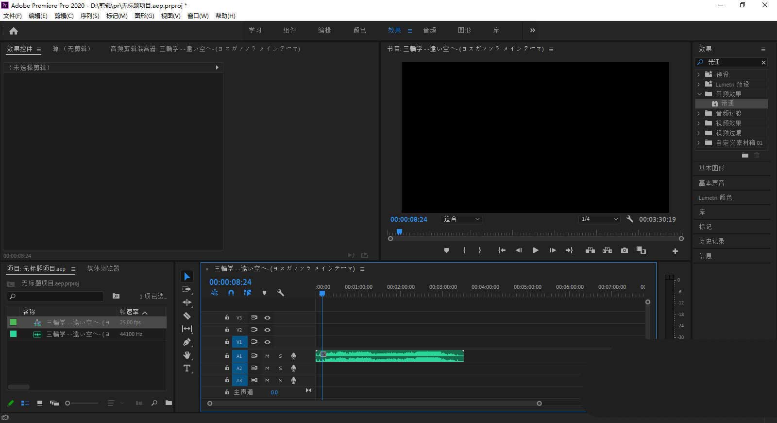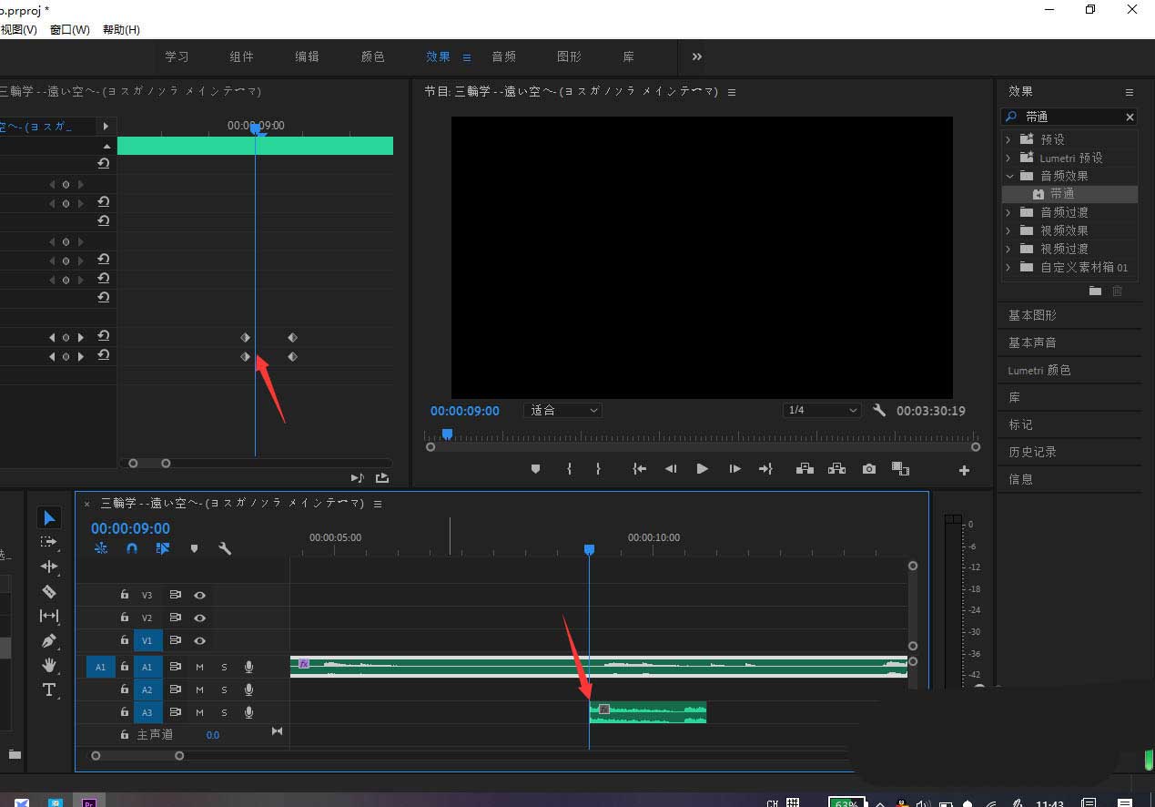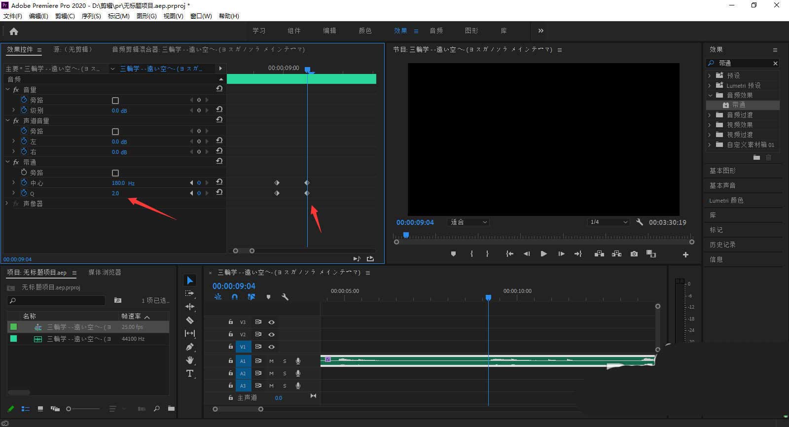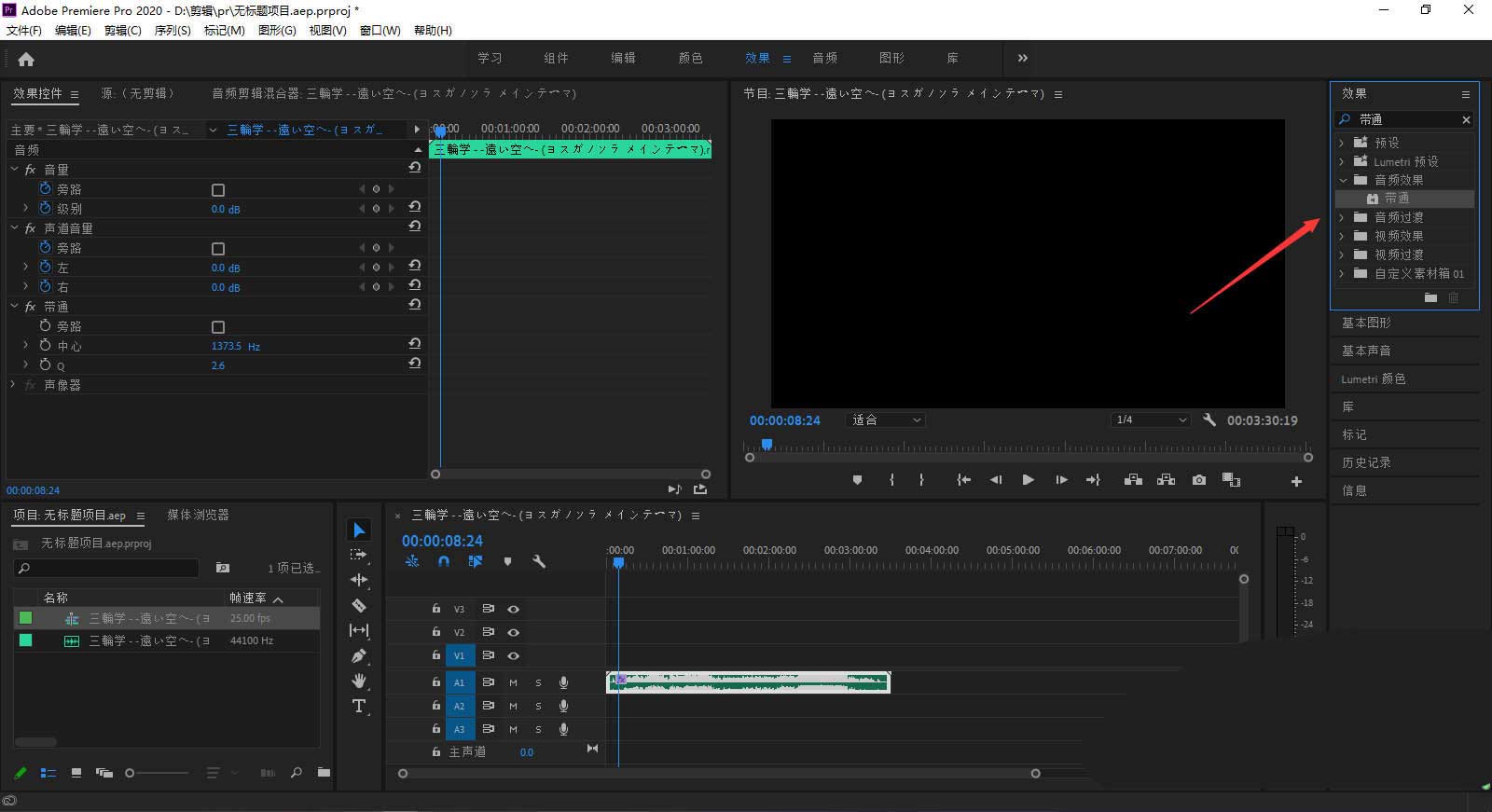 2、在效果中找到帶通,將其拖到音頻素材上。
