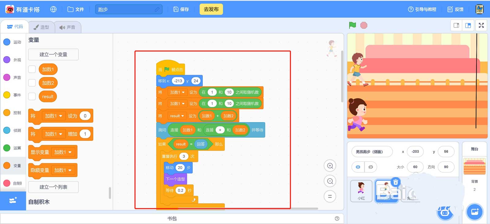 6、接著是小男孩的代碼。這里小男孩,我們讓他通過回答問題的方式前進(jìn),如果回答正確了,跑一截。首先設(shè)置隨機(jī)的詢問10以內(nèi)的加法。