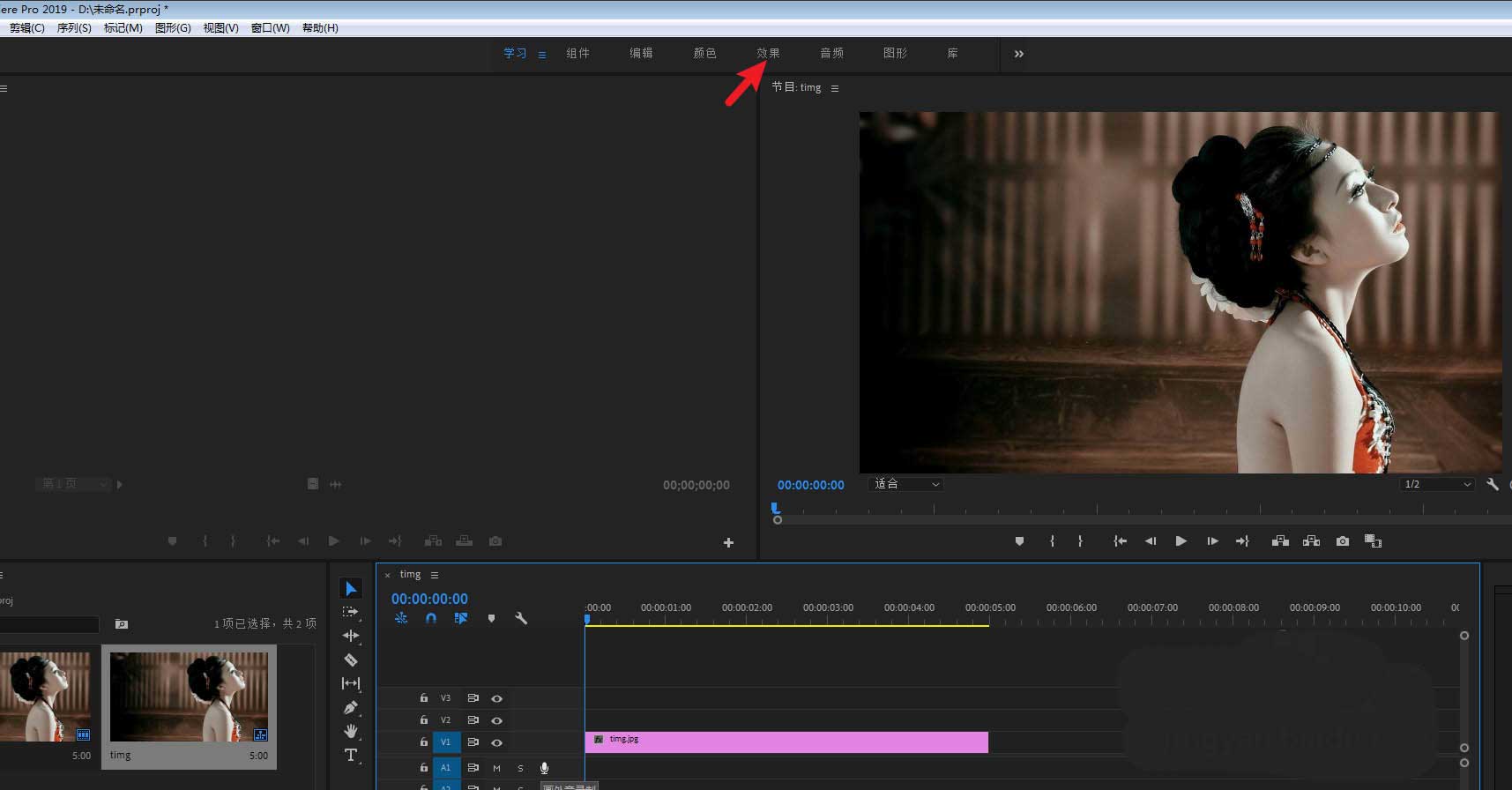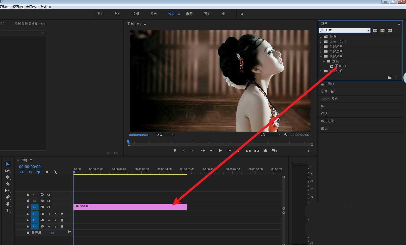 1、打開(kāi)pr,在pr里把圖片拖入時(shí)間軸。