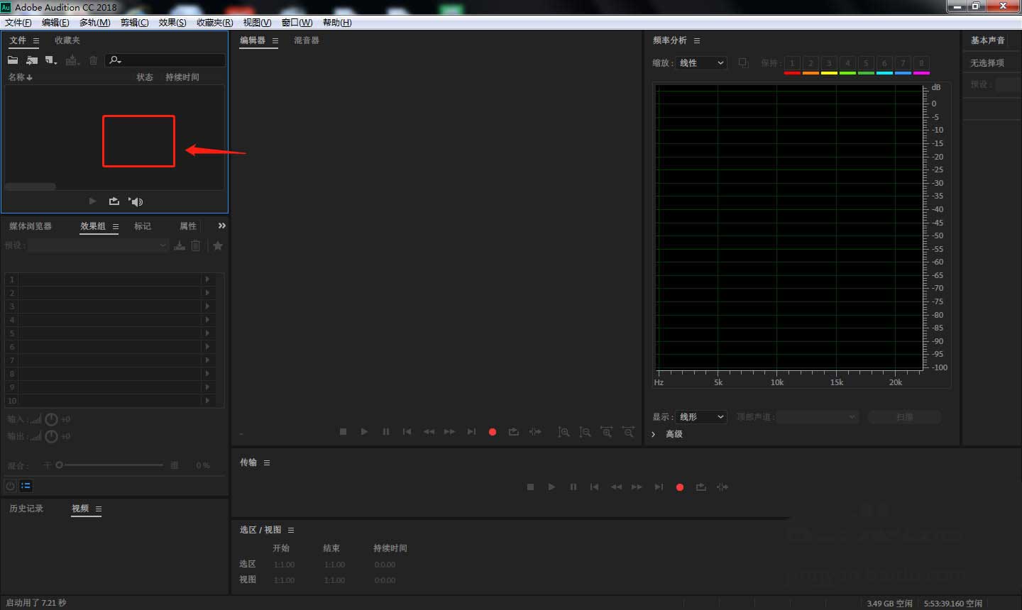 1、首先在電腦中打開AU軟件,點(diǎn)擊左上角區(qū)域,將需要的音頻文件導(dǎo)入。