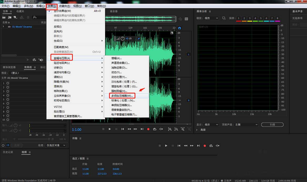 4、點(diǎn)擊頂部工具欄中的“效果”——“振幅與壓限”——“多頻段壓縮器”。
