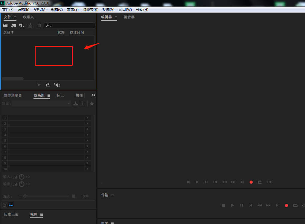 1、首先在電腦中打開AU軟件,點擊左上方區(qū)域,將需要的音頻導入。