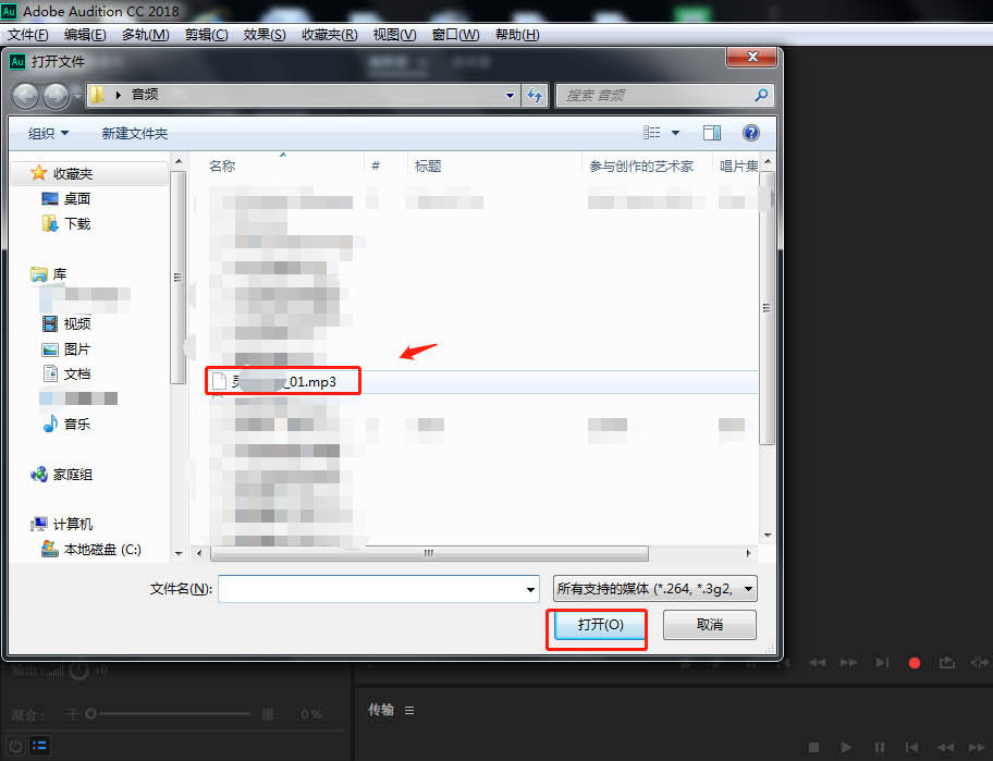 2、在彈出的導入文件窗口中,選擇需要的音頻素材文件,然后點擊打開。