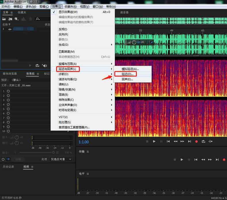 4、點擊頂部工具欄中的“效果”——“延遲與回聲”——“延遲”。