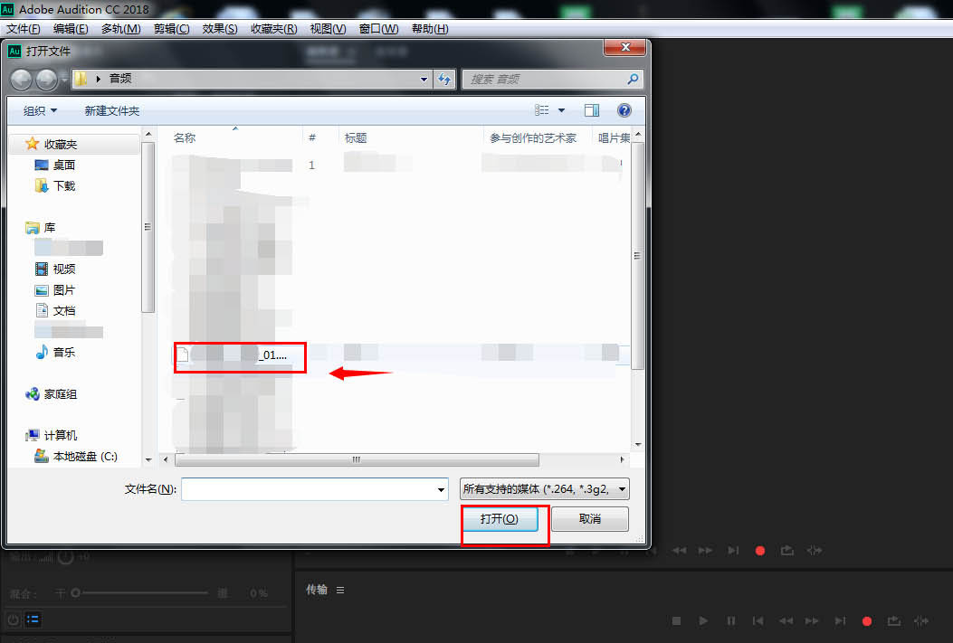 2、在彈出的導(dǎo)入文件窗口中,選擇需要的音頻素材,點(diǎn)擊打開(kāi)。