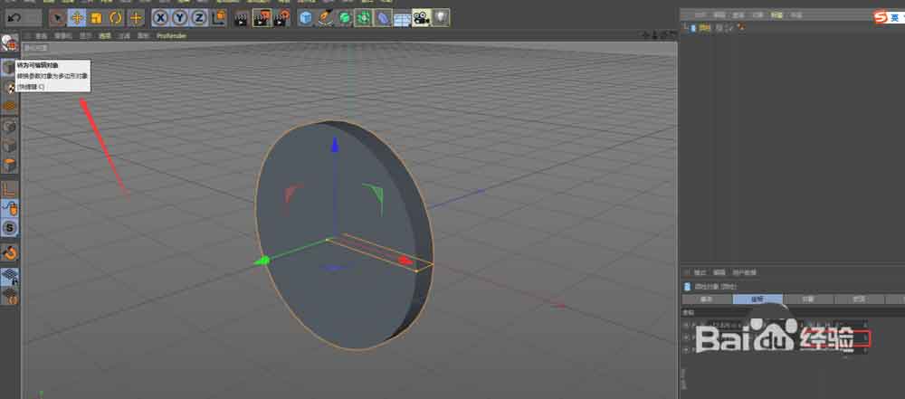 2、在場景中創(chuàng)建一個圓柱,調整大小和方向,然后按下C鍵轉換為可編輯對象;
