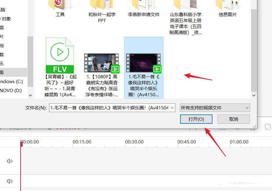 2、在電腦存儲中找到需要添加的視頻短片,點(diǎn)擊選定,然后點(diǎn)擊箭頭所指的打開按鈕。