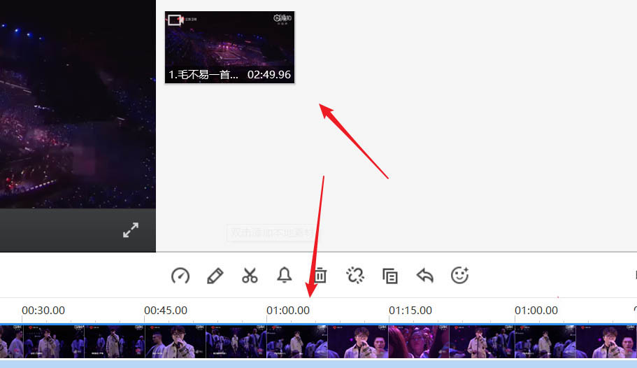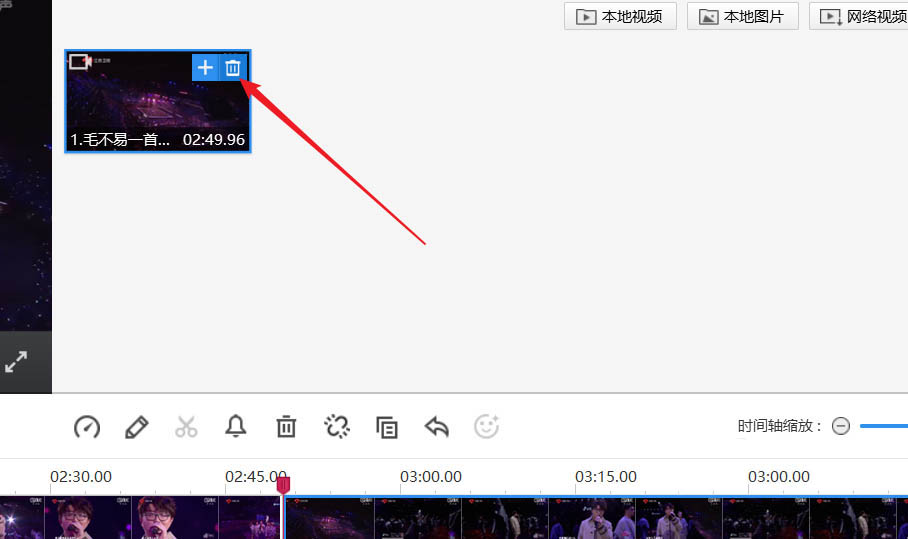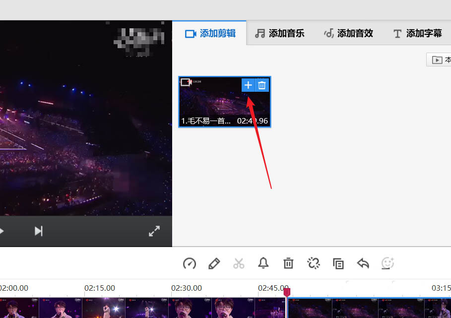 4、我們將電腦鼠標(biāo)移動到視頻上,視頻右上角出現(xiàn)一個加號,點(diǎn)擊加號,可以重復(fù)添加該視頻。