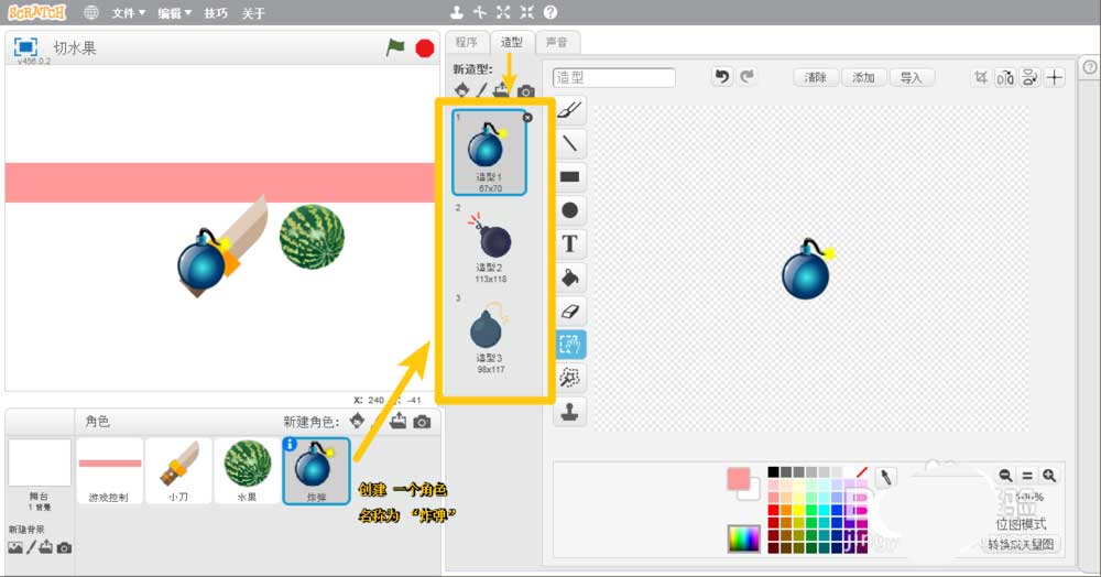 2、創(chuàng)建角色。創(chuàng)建4個角色:“游戲控制”“小刀”“水果”“炸彈”。(水果和炸彈角色,可以自己增加多種造型)