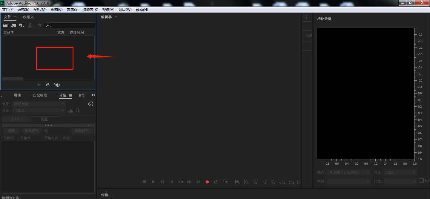 1、首先在電腦中打開(kāi)AU軟件,點(diǎn)擊左上方區(qū)域,將需要的音頻導(dǎo)入。