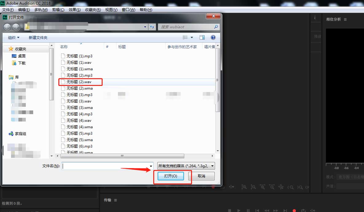 2、在彈出的導(dǎo)入文件窗口中,選擇需要的音頻素材,點(diǎn)擊打開(kāi)。