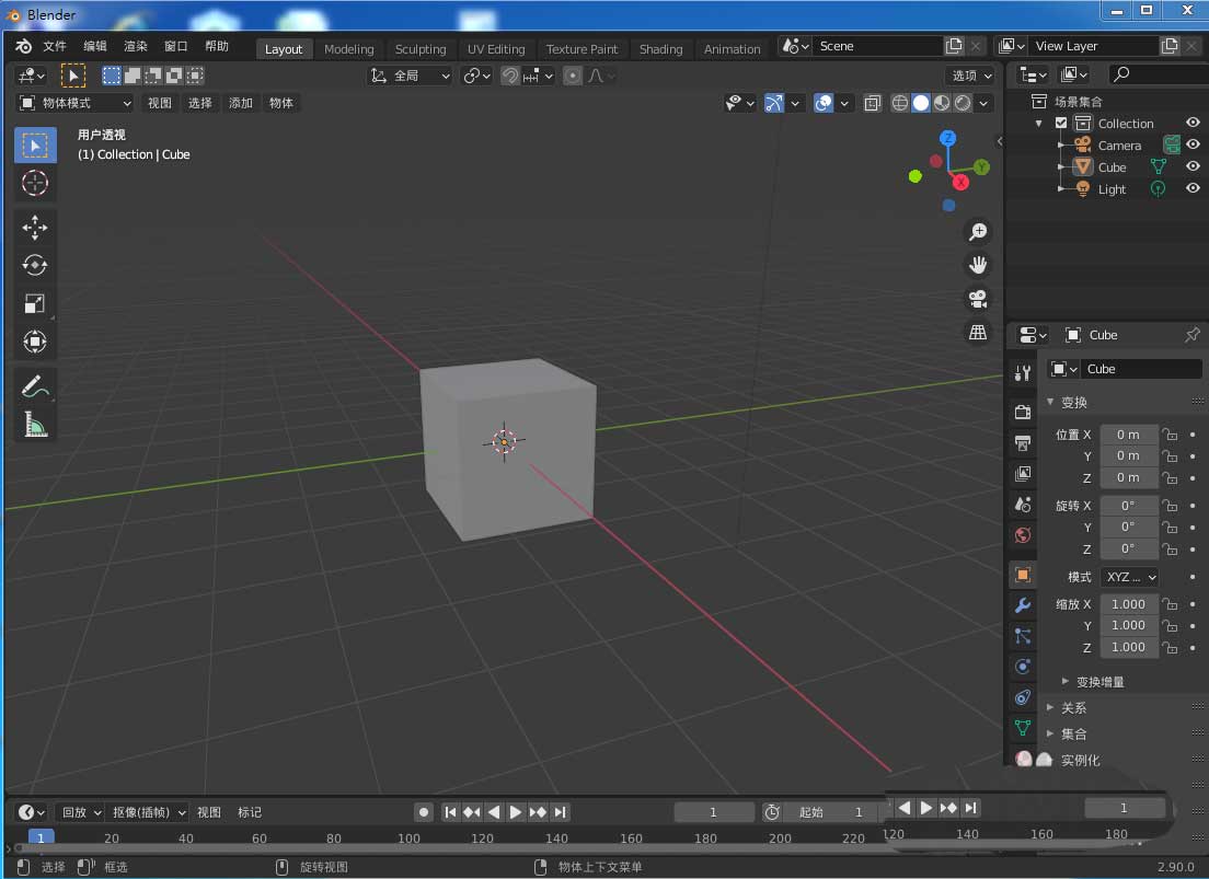 1、打開(kāi)blender軟件,打開(kāi)后,可以看到blender自帶一個(gè)立方體模型,不要?jiǎng)h除,如下圖