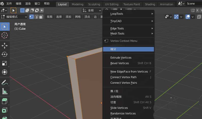4、按Tab鍵進(jìn)入編輯模式,單擊右鍵,點(diǎn)擊細(xì)分,如下圖