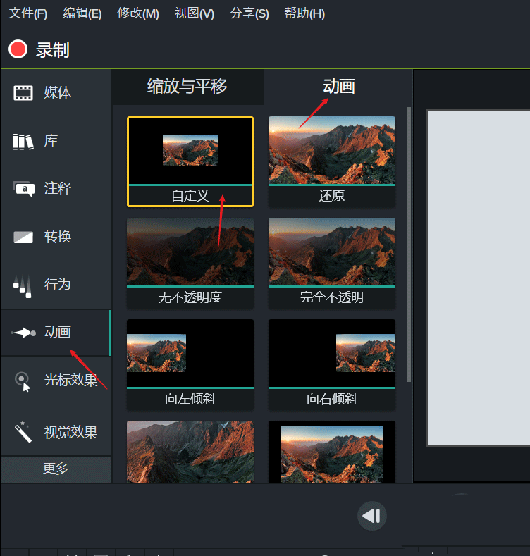 2、點擊左側(cè) 動畫 找到動畫自定義特效 直接拖拽到右側(cè)窗口中