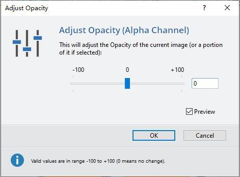 打開"Adjust Opacity"操作對話框,默認的"Opacity"屬性參數(shù)值為"0"。