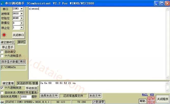 10:觀察串口調(diào)試軟件的接收區(qū)回傳回來的siemens字符。