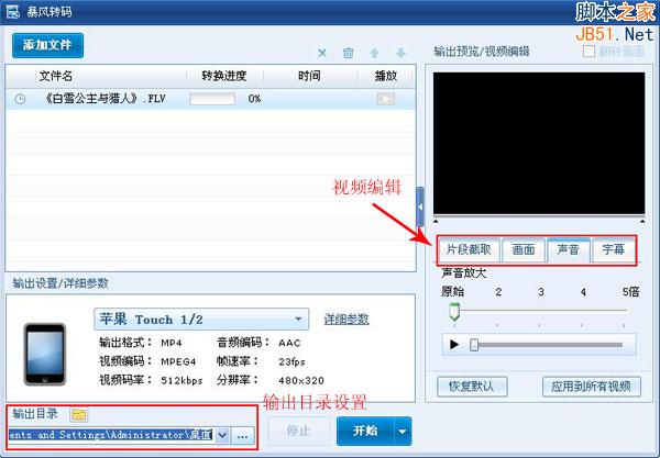 格式選擇完成之后,回到軟件主界面,在軟件的右邊具有視頻編輯功能,其中包括,視頻截取、畫面裁切、聲音縮放及添加字幕等幾項功能。不需要的朋友,可直接設(shè)置文件的輸出目錄。