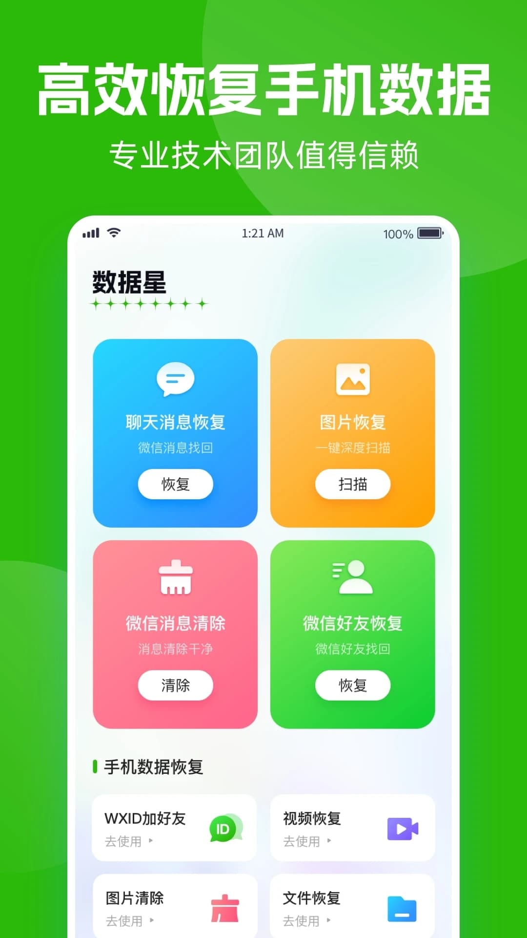 數(shù)據(jù)星是一款專注于手機與微信數(shù)據(jù)恢復的專業(yè)工具軟件。整體的恢復功能特別的強大,各種被誤刪的文件都可以通過掃描的方式快速恢復,所有掃描結果都會進行記錄,是專門對所有用戶的數(shù)據(jù)進行恢復和保護的,而且采用的是一對一得專人服務,能夠滿足用戶的各種數(shù)據(jù)恢復需求。