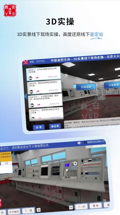 北京中教安達(dá)消防科技有限公司,根據(jù)國家初、中、高級消防設(shè)施操作仿真考試系統(tǒng)開發(fā)的學(xué)習(xí)和練習(xí)系統(tǒng)??梢匀矫娴姆抡婵荚嚕蛧铱荚嚮疽恢?。是根據(jù)總隊消防訓(xùn)練基地,鑒定站真實(shí)場景,開發(fā)的消防設(shè)施操作員三維VR實(shí)操軟件,有初、中、高級實(shí)操,全景三維仿真、操作和現(xiàn)場操作一樣。同時還擁有實(shí)操仿真和理論考試,可以大幅度提高通過率。 PC,Android,理論題庫賬號互通