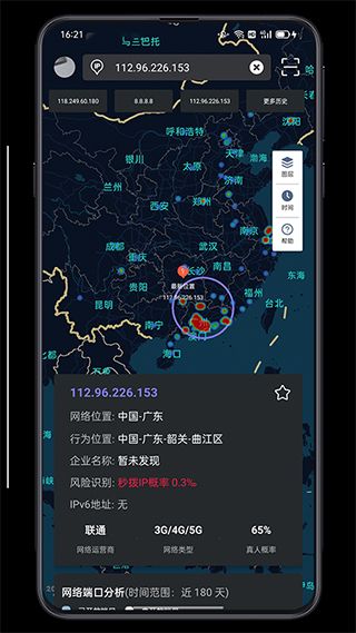 IP地理位置:查詢單個或多個IP地址時,可以在地圖中展示這些IP的地理覆蓋范圍,以及流量使用情況。