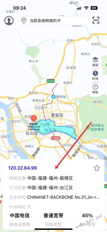 1、地圖頁面,顯示了當前連接網(wǎng)絡(luò)的IP地址及其所在的地理位置信息,包括網(wǎng)絡(luò)位置和行為位置等。