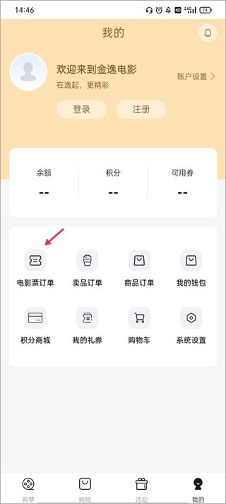 1、在金逸電影app中“我的”功能界面下選擇點(diǎn)擊“電影票訂單”功能選項(xiàng)。