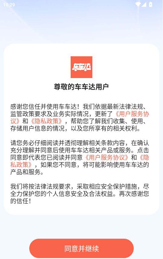 1.打開軟件閱讀“用戶服務協(xié)議和隱私政策”點擊“同意并繼續(xù)”進入APP