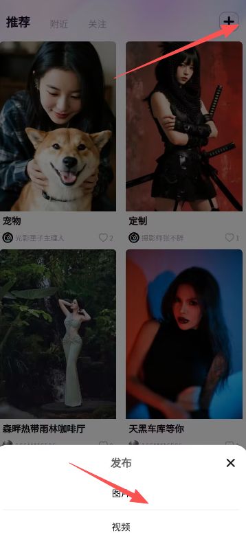 2、進入軟件在首頁點擊右上角+號,可選擇發(fā)布圖片或視頻內(nèi)容。