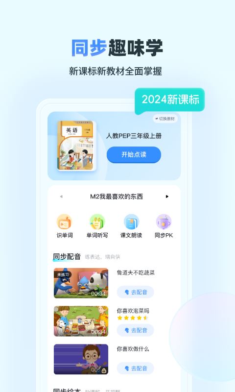 用戶可以使用同步英語教材進(jìn)行點(diǎn)讀學(xué)習(xí),能夠跟隨朗讀小學(xué)英語教材課本。